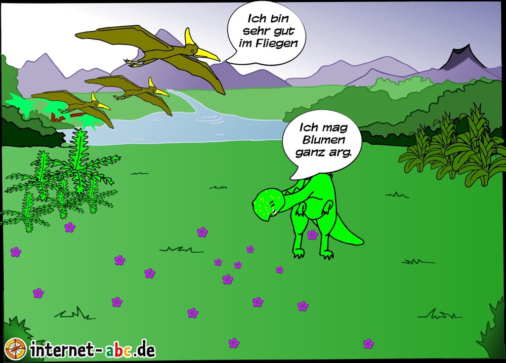 Der Flugdrache und seine Kinder ziehen durch die Welt und jedes Jahr kommen sie an dem Dinosaurier vorbei der Blumen mag.