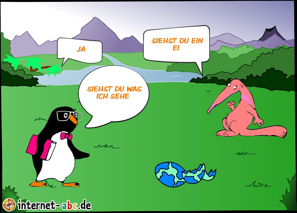 SIE GEHEN DURCH DIE WIESE PLÖTZLICH SEHEN SIE EIN EI UND WUNDERN SICH WAS FÜR EIN EI DAS WÄR.