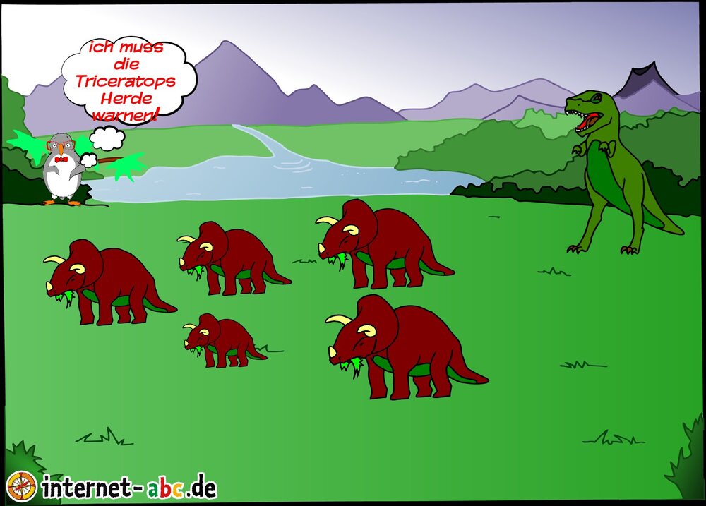 Eddie sieht wie ein T-Rex auf die Triceratops-Herde zukommt. Er muss sie warnen!