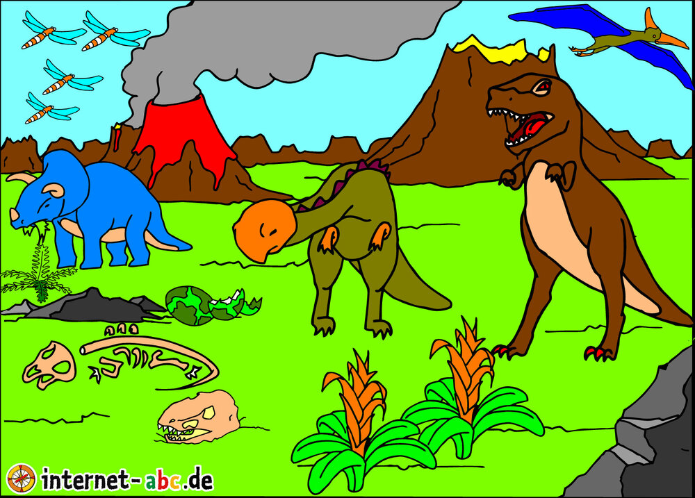 in der Urzeit ist viel los, da fliegt ein flugsaurier, unten liegt ein skellet und ein schädel. tronto hat gerade ein ei gelegt.