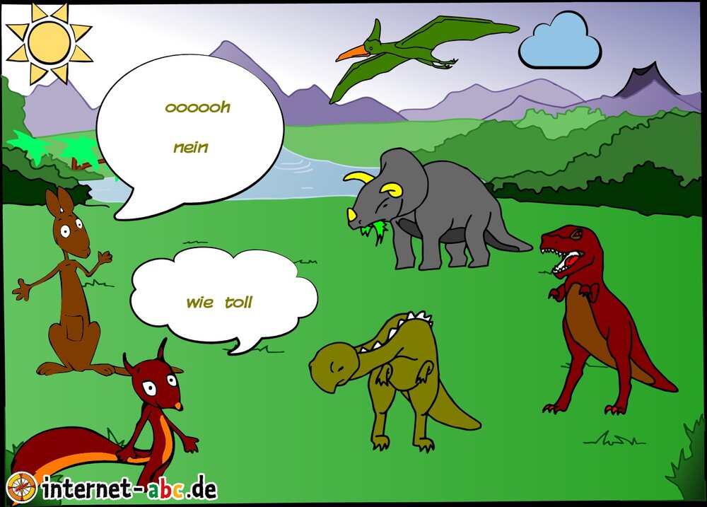 Der Hase landet plötzlich bei den Dinosauriern er erschrak und wollte sofort abhauen . Doch sein freund hielt ihn zurück und sagte : das ist doch toll bei den Dinos oder?