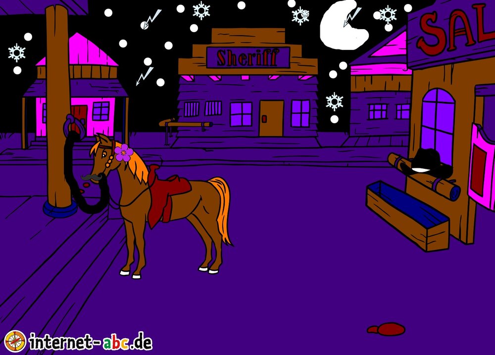 Wie geht ein Cowboy Start und es ist gerade Nacht und ein Pferd steht angelehnt an einer Säule und sein Reiter beziehungsweise sein Cowboy hat seinen Hut draußen an seiner Trinken vergessen, aber er pennt aber trotzdem weiter