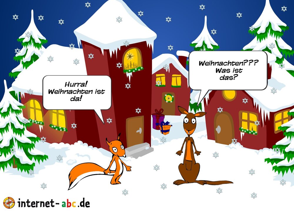 Das Känguru ist von weitem angereist. Deshalb weiß es leider nicht was Weihnachten ist. Aber das Eichhörnchen erklärt es ihm!
