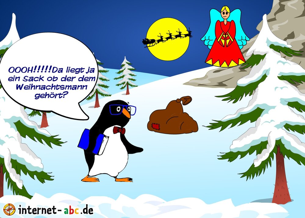 Es sind Geschenke drin Eddi guckt zum Himmel und sieht den Weihnachts mann vorbeifliegen. Plötzlich steht vor ihm ein Engel und sagt:Darf ich bitte den Sack haben er gehört dem Weihnachtsmann!.