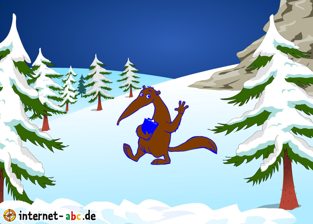 Der Ameisenbär ist an Weihnachten unterwegs zum Weihnachsmann er hat die Wunschlisten in einer blauen Mappe ferstaut.