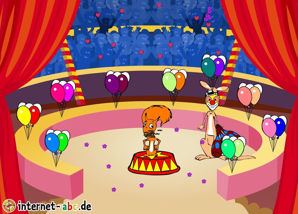 Der Zirkus Clownsnase.Jumpy ist der Clown.Der Zirkusdirektor mit dem Vollbart sagt das die Show bald beginnt.Am Rand stecken Ballons.