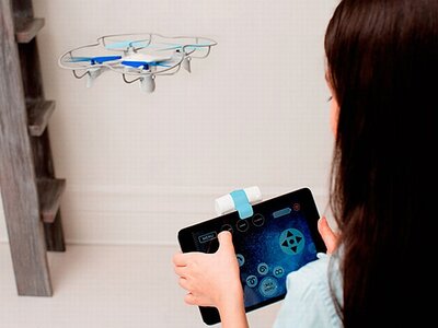 Lumi ist eine federleichte Drohne, die du durch die Luft fliegen lassen kannst. Bevor es los geht, musst du eine App herunterladen und eine Batterie in die kleine Fernbedienung legen. Erst dann hebt Lumi mit seinen blauen Flügeln ab.