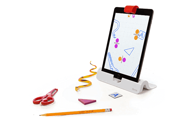 Dieses Spiel ist etwas ganz Neues. Du brauchst dafür ein iPad und den "Osmo Starter Kit". Der besteht unter anderem aus einem Fuß, in den das iPad gestellt wird. Über die Kamera wird nun ein roter Bügel gestülpt, in dem sich ein Spiegel befindet.