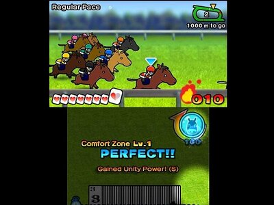 bei diesem Spiel muss ein Pferderennen gewonnen werden. Die Figuren sind niedlich und alles sieht aus wie in einem Comic. Damit die Pferde laufen, musst du im unteren Bildschirm Karten legen. Je besser du das kannst, umso schneller reitet dein Rennpferdchen.