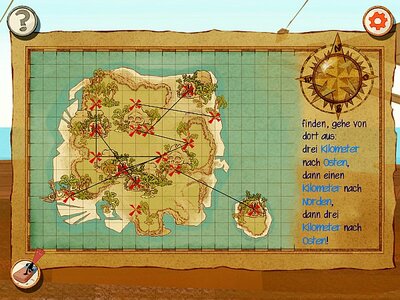 Um die Schätze zu finden, brauchst du ein scharfes Auge: Lies die Anweisungen genau! Am Anfang ist das noch leicht. "Der Schatz ist am Fuß der Palme vergraben, die am weitesten im Osten steht."