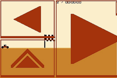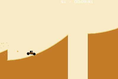 Es gibt hier nur ein einziges Rennauto, weit und breit gibt es keine Gegner. Dein Wagen sieht auch nicht wirklich schnittig aus. Aber er hat es in sich. Mit ihm rast du über gerade Strecken, steile Berge oder springst über große Schluchten.