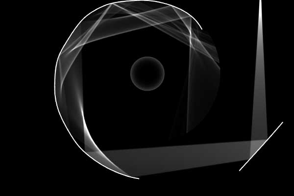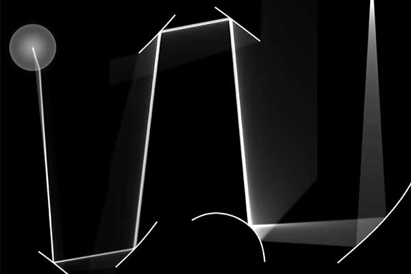 Das Physikspiel "Lyxo" zeigt zunächst bloß einen schwarzen Bildschirm. Nur ein Lichtstrahl und eine Kugel sind erkennbar.