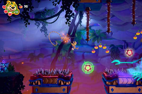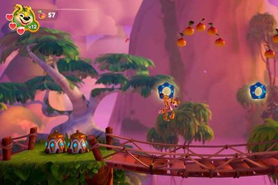 Oder es zerschmettert Kisten und Holzbrücken und schaltet hypnotisierte Gegner mit einem Peitschenhieb seines langen Schwanzes aus. Unterwegs sammelt es Federn, Äpfel und weitere Obstsorten.
