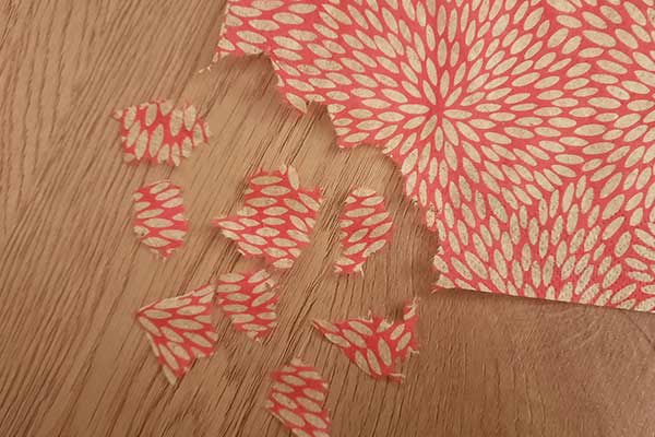 Zieht die oberste bedruckte Schicht von der Serviette ab. Diese hauchdünne Lage reißt ihr in kleine Stückchen.