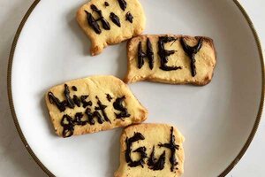 Wenn die Plätzchen abgekühlt sind, kannst du mit geschmolzener Schokolade verschiedene Nachrichten auf sie schreiben.
