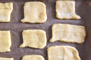 Forme an einer Ecke der Plätzchen einen Zipfel und backe sie für 13 Minuten bei 180 Grad im Backofen.