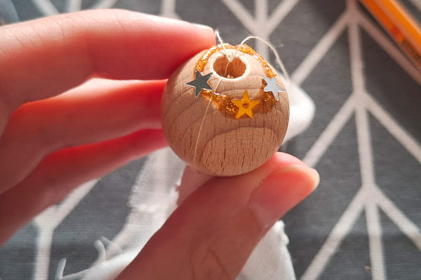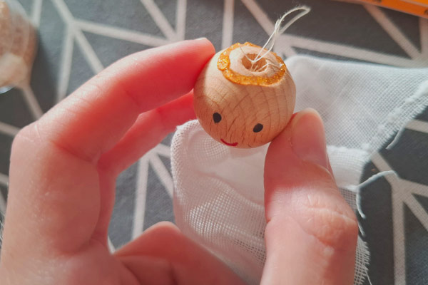 Für den Heiligenschein nehmt Ihr einen Kleber eurer Wahl und malt einen Kreis um das obere Loch der Holzperle. Bittet dabei eure Eltern um Hilfe.
