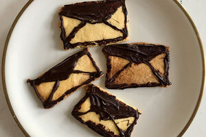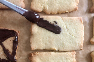 Wenn die Plätzchen abgekühlt sind, kannst du mit geschmolzener Schokolade, die Rechtecke als Briefe gestalten.