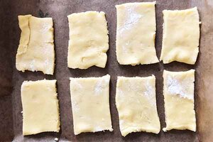 Wenn du ein rechteckiges Ausstechförmchen hast, kannst damit die Plätzchen ausstechen. Sonst schneidest du kleine Rechtecke.