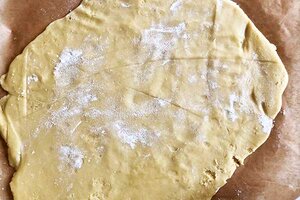 Dann kann der Teig mit einem Nudelholz ausgerollt werden. Dazu kann der Teig zusätzlich noch mit Mehl bestäubt werden.