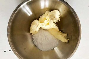 Füge 200g Butter und ein Päckchen Vanillezucker hinzu.