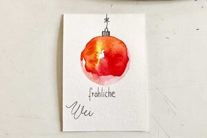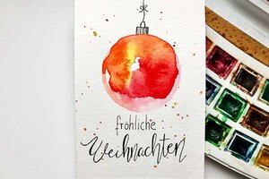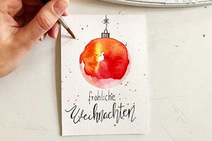 Unter die Weihnachtskugel kannst du zum Beispiel "Fröhliche Weihnachten" schreiben.