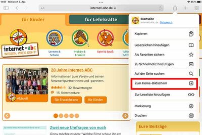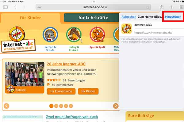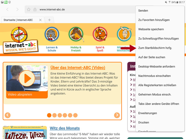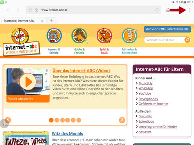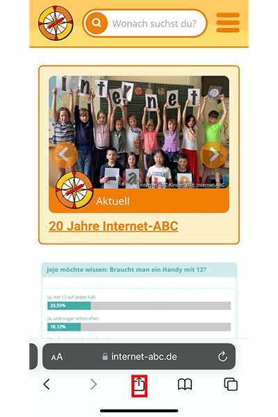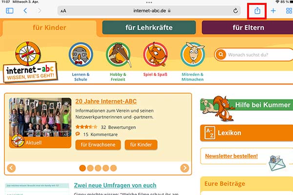 Im Browser des Geräts www.internet-abc.de aufrufen. Rechts oben im Browser auf das das kleine Quadrat mit dem Pfeil nach oben wählen.