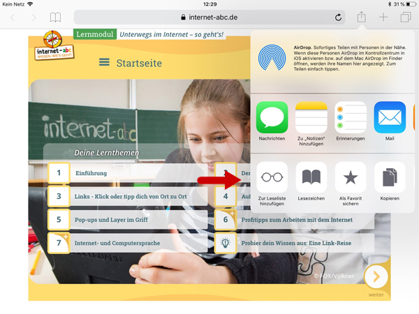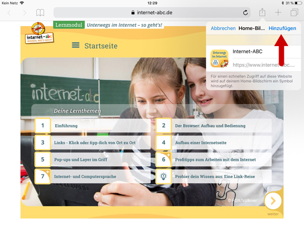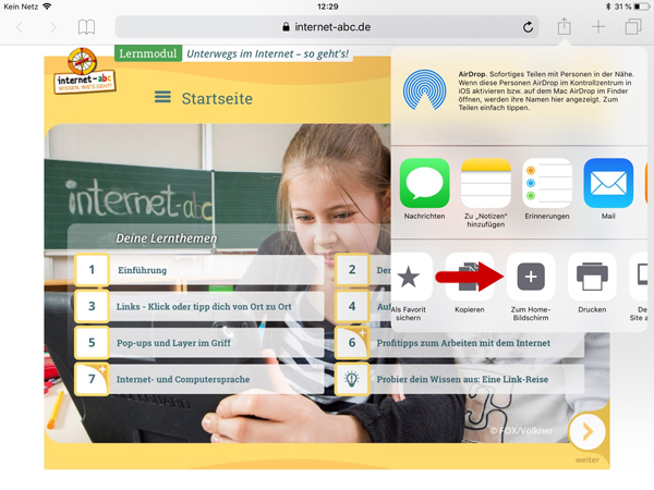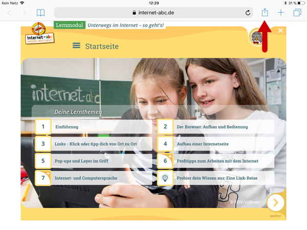 Im Browser des Geräts www.internet-abc.de aufrufen. Rechts oben im Browser auf das das kleine Quadrat mit dem Pfeil nach oben wählen.