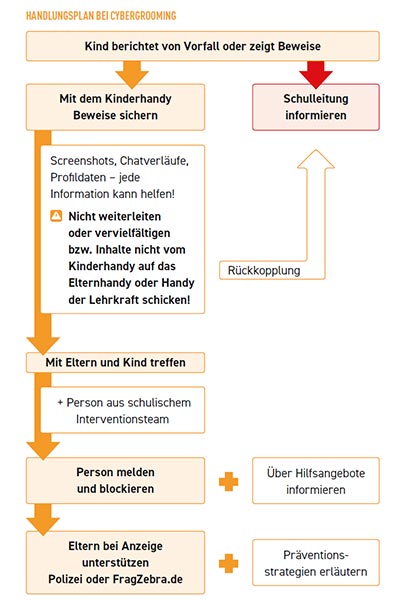 Nur wenn Schulen und Familien gemeinsam gegen Cybergrooming aktiv werden, können die Bemühungen erfolgreich sein. Im Folgenden soll ein strukturiertes Vorgehen aus Sicht der Schule aufgezeigt werden.
