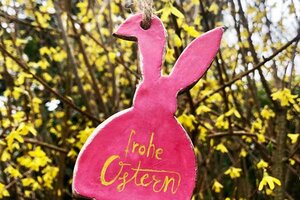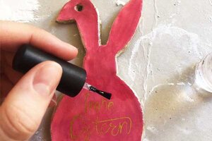 8. Verziere den Hasen mit “Frohe Ostern“ oder einem Muster. Wenn er glänzen soll, male ihn mit Klarlack an.
